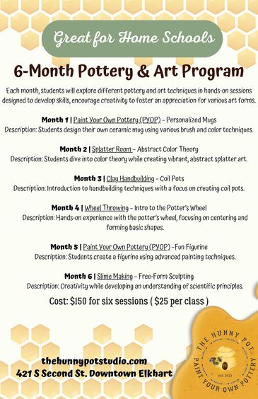 Join us for a 6-month journey of creativity and exploration in pottery, art, and science! This program is designed to enrich homeschoolers’ education with hands-on projects that blend art, design, and STEM concepts. Each month, students will engage in activities that encourage creativity, critical thinking, and skill development while having fun.