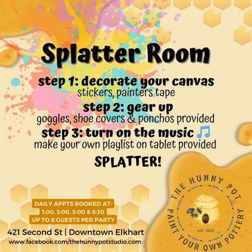 Protective gear and speaker provided to cover you while you let loose to loud music that inspires you! Glitter, Neon paint and black light available.